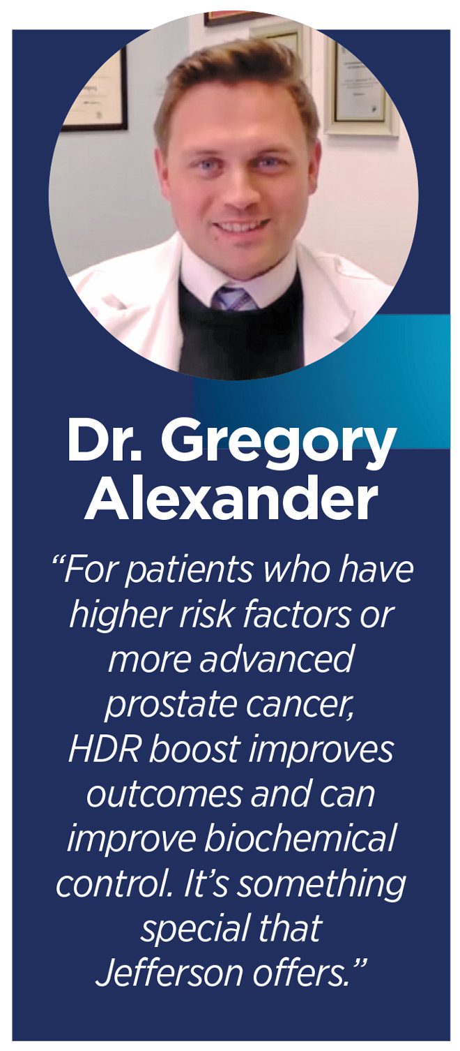 At Jefferson, we have the option of doing high dose-rate brachytherapy, or what’s called HDR boost, for patients with high-risk prostate cancer. Patients undergo sedation, and an ultrasound probe is used to help guide the radiation. Basically, needles are used to introduce catheters into the prostate, and then we have something called an HDR afterloader, which introduces a radioactive source into the prostate. That radioactive source goes through these channels, delivers the radiation, and then is removed from the patient. For patients who have higher risk factors or more advanced prostate cancer, HDR boost improves outcomes and can improve biochemical control. It’s something special that Jefferson offers.