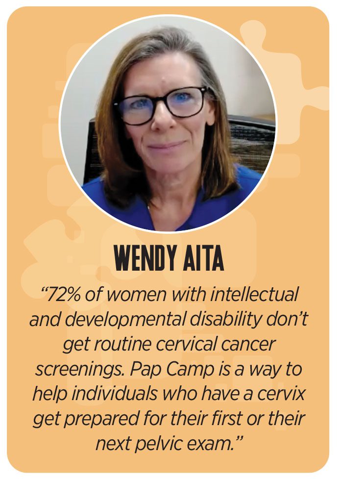 72% of women with intellectual and developmental disability don’t get routine cervical cancer screenings. Pap Camp is a way to help individuals who have a cervix get prepared for their first or their next pelvic exam. It includes what to expect from their provider, including the ability to have a stop signal. They learn how to calm their mind. We talk about any sensory challenges, and they can come up with what might be more comfortable for them. Everything gets written down in their chart so the provider can read it, and they can have the accommodations they need.