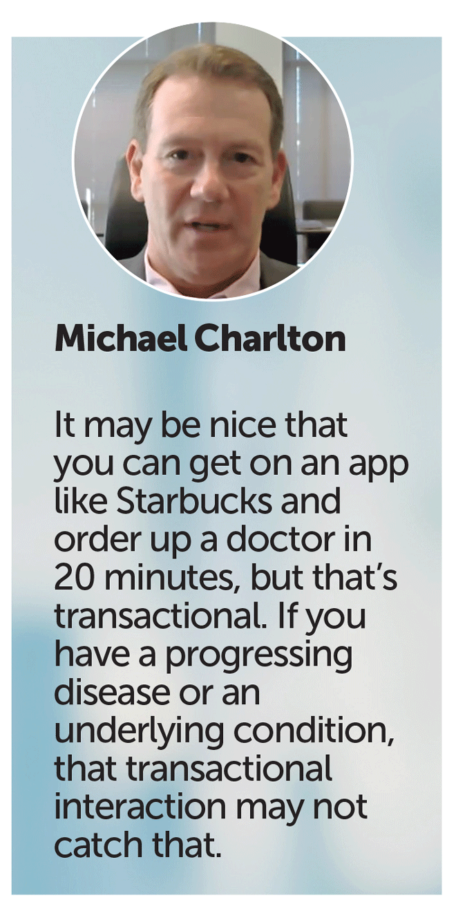 I’m so conflicted about this, because access is such an incredibly important thing. But healthcare can’t be transactional. It just can’t. You need the human touch, and you need that longitudinal record. It may be nice that you can get on an app like Starbucks and order up a doctor in 20 minutes, but that’s transactional. If you have a progressing disease or an underlying condition, that transactional interaction may not catch that.