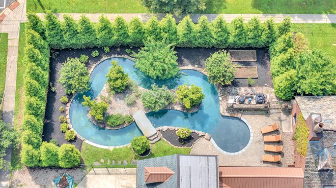 The Lazy River One of the most surprising features on the property is just off the kitchen hallway, right past the brick patio – a man-made lazy river, which wraps around an island. A quaint bridge connects the island to the patio. Outdoor spaces also include a 3-car garage with additional living space on second floor and a full bath.