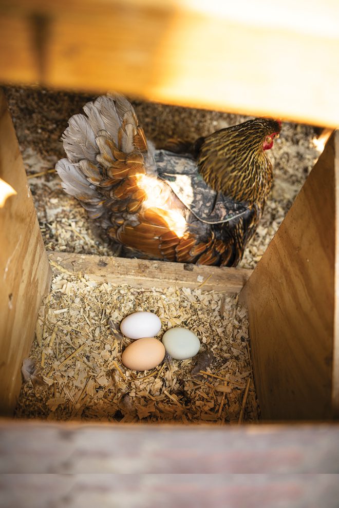 “People say, with the price of eggs, you must be saving a lot having your own chickens,” he says. “These are the best-fed chickens in America, and it costs us. It’s like $100 a dozen.”