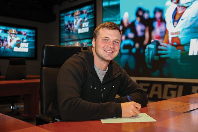 “So much work to do,” McCord says. “Every day I’m tested here. Every day I have to perform. I love it. I love the challenge. I’m home and I’m happy. This is where I want to be to become the best quarterback I can be. Everything else works around that.”